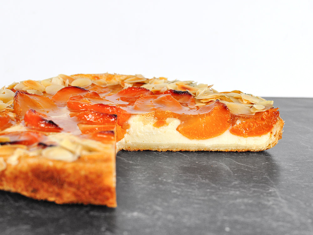 Unsere Aprikosen-Tarte kombiniert knusprigen Blätterteig mit einer saftigen Schmand-Quark-Masse, frischen Aprikosen und gehobelten Mandeln. Diese köstliche Tarte bringt den Geschmack des Sommers direkt auf den Tisch. Kuchenstücke: 6