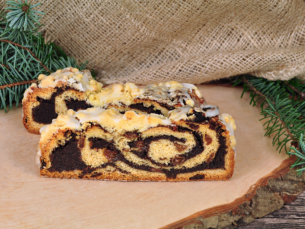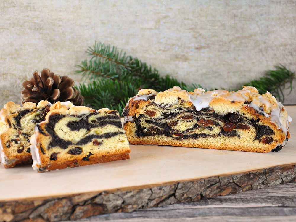 Wer von unserem Mohnstollen nicht genug bekommt, sollte unbedingt auch unseren Mohnstriezel versuchen – einem leichten Rosinenstollenteig mit eingerollter Mohnfüllung. Veredelt wird die Backspezialität mit Butterstreusel und einer Zuckerglasur, die auch bei der Dekoration zur Geltung kommt. So wird unser Mohnstriezel zu einer Zierde für jede festlich gedeckte Weihnachtstafel. Die Mohnmasse für unseren Striezel wird aus frisch gemahlenem Mohn hergestellt. Wir setzen ausschließlich auf Zutaten, die höchste Qualitätsansprüche erfüllen. Wie unser gesamtes Stollen-Sortiment wird auch der Mohnstriezel handwerklich gefertigt.