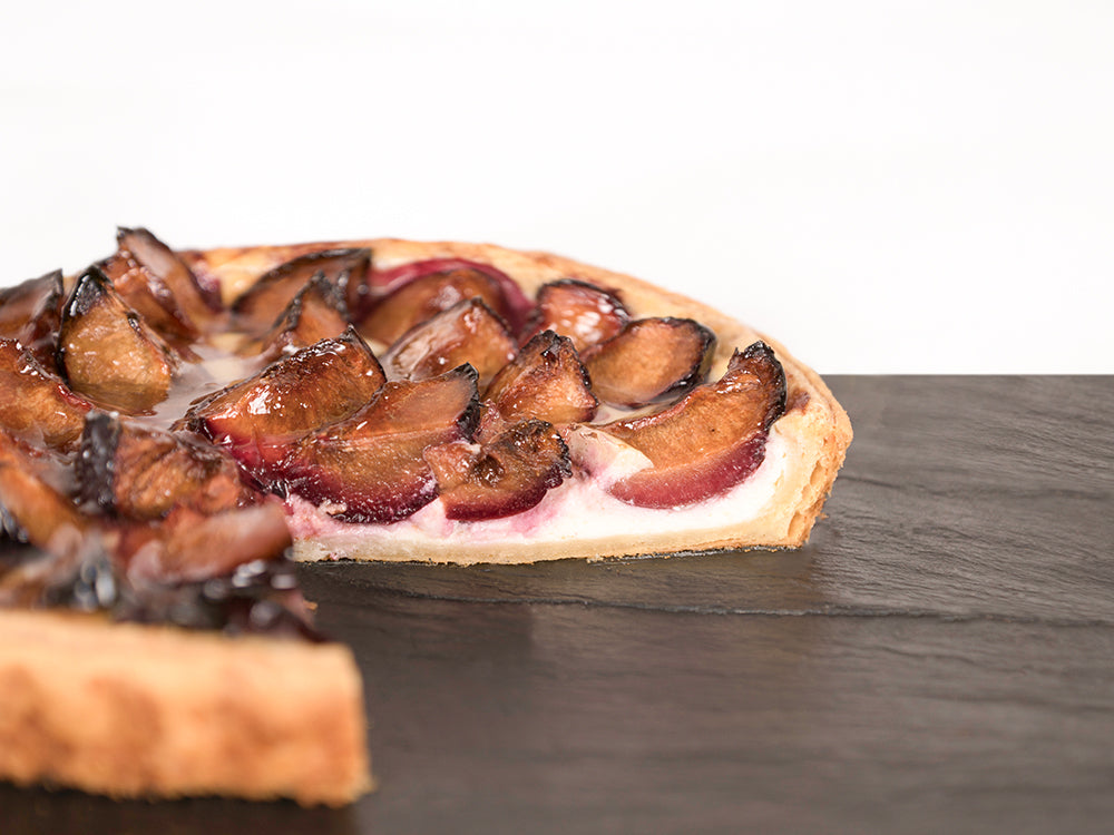Unsere Pflaumen-Tarte kombiniert knusprigen Blätterteig mit einer saftigen Schmand-Quark-Masse, frischen Pflaumen und gehobelten Mandeln. Diese köstliche Tarte sorgt jederzeit für besondere Genussmomente.