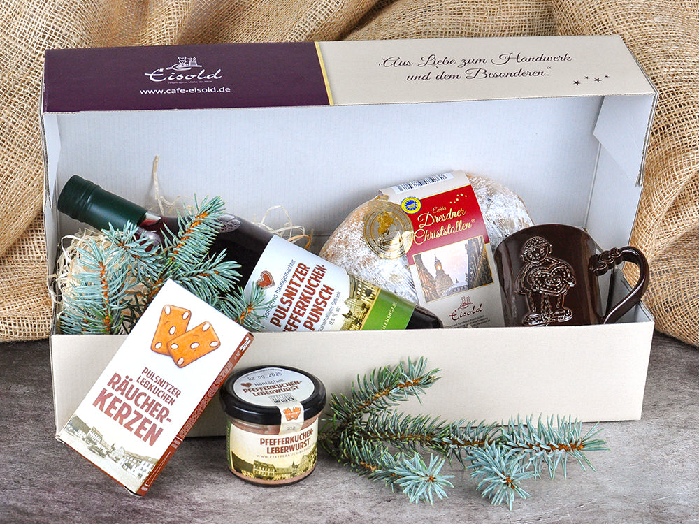 Unsere Pulsnitzer Genussedition ist eine Kombination aus unserem 500 g Dresdner Christstollen und einer feinen Auswahl Pulsnitzer Spezialitäten: Pfefferkuchenleberwurst, Pfefferkuchenräucherkerzen, eine Flasche Pfefferkuchenpunsch 0,75 l und eine Pfefferkuchentasse. Dieses liebevoll zusammengestellte Set versprüht Wärme, Tradition und süß-würzige Genussmomente – ideal, um sich selbst oder Ihre Liebsten zu verwöhnen.
